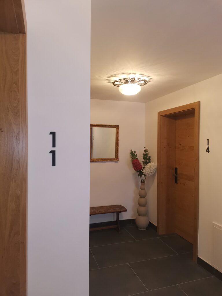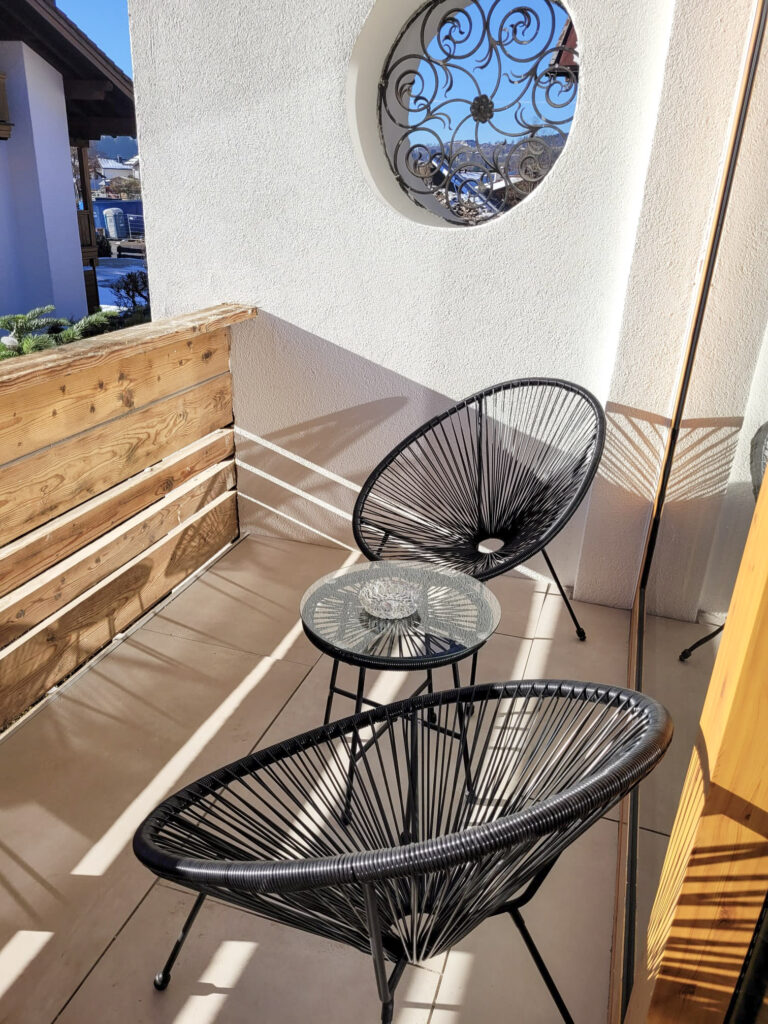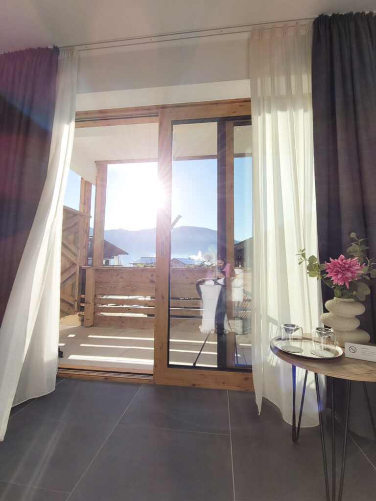 The bright furnishings in a natural wood style create a warm, inviting atmosphere. The ground-level balcony offers a magnificent view of the surrounding mountains and invites you to pause and enjoy.