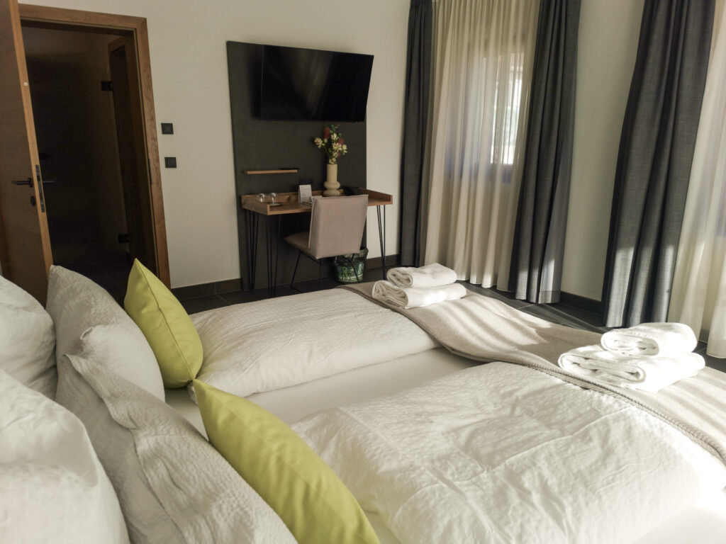 With a TV, plenty of natural light, and generous amenities, the Hauchen double room combines living comfort, spaciousness, and barrier-free accessibility in a stylish ambience.