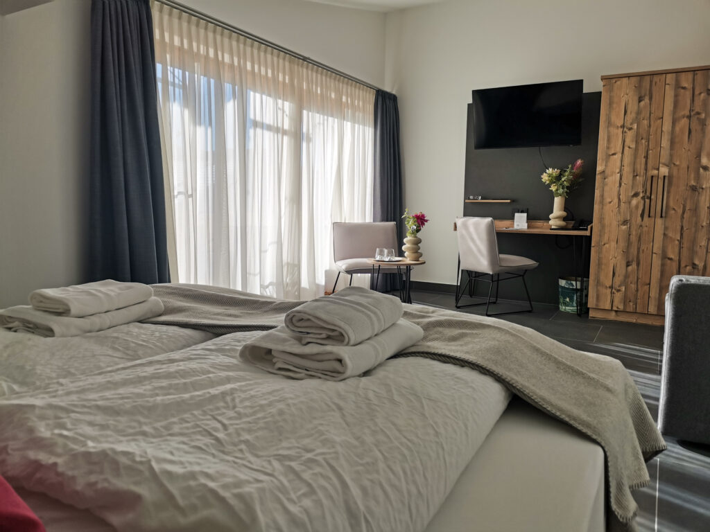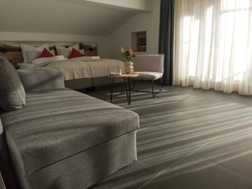 Stylish living with a view: our Kaiserblick double room impresses with its spaciousness, high-quality furnishings, and a fantastic view of the surrounding mountains—perfect for guests who value comfort and atmosphere in equal measure.